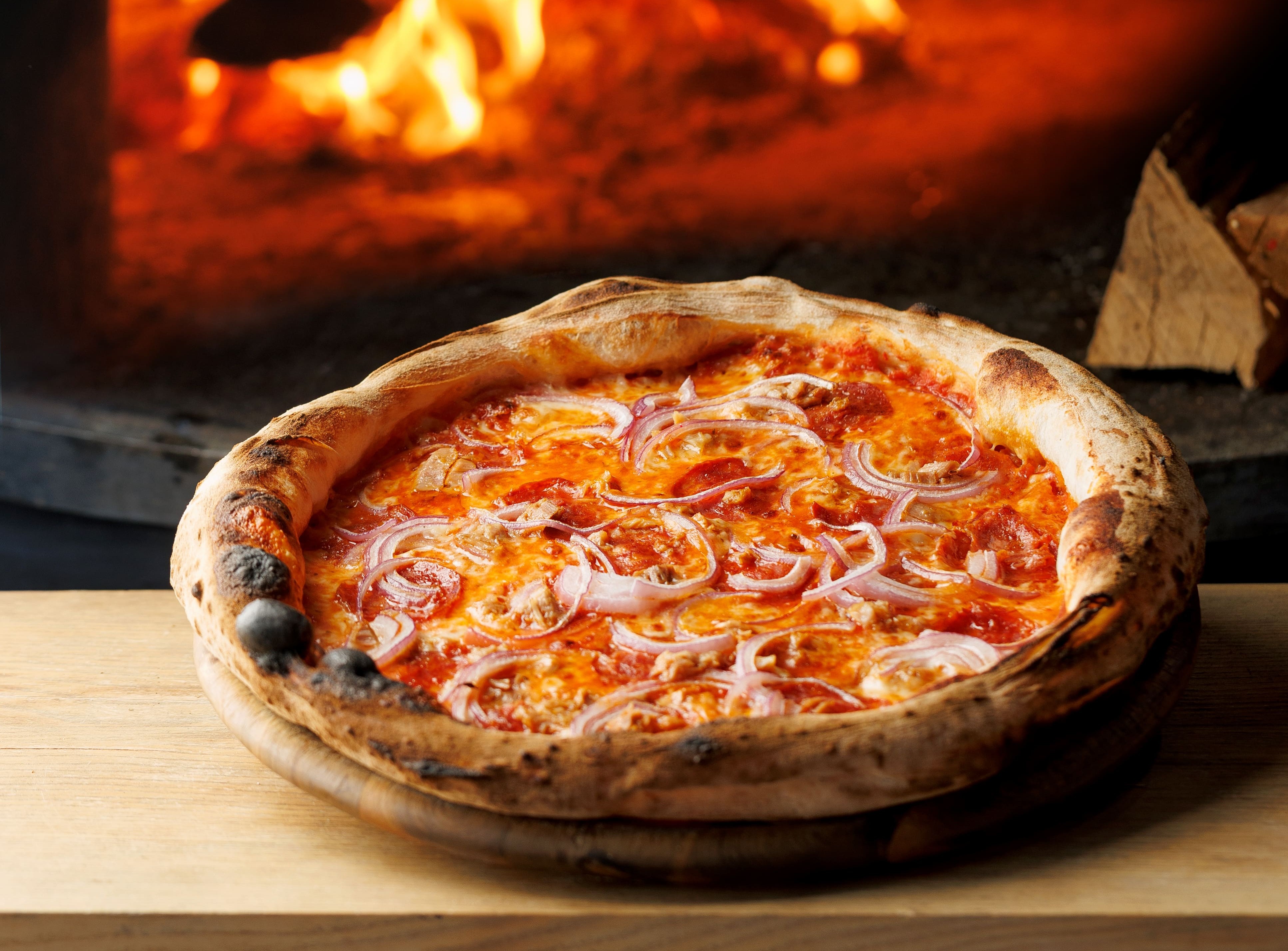 Sos marinara , mozzarella, salam picant, ton, ceapă roșie.